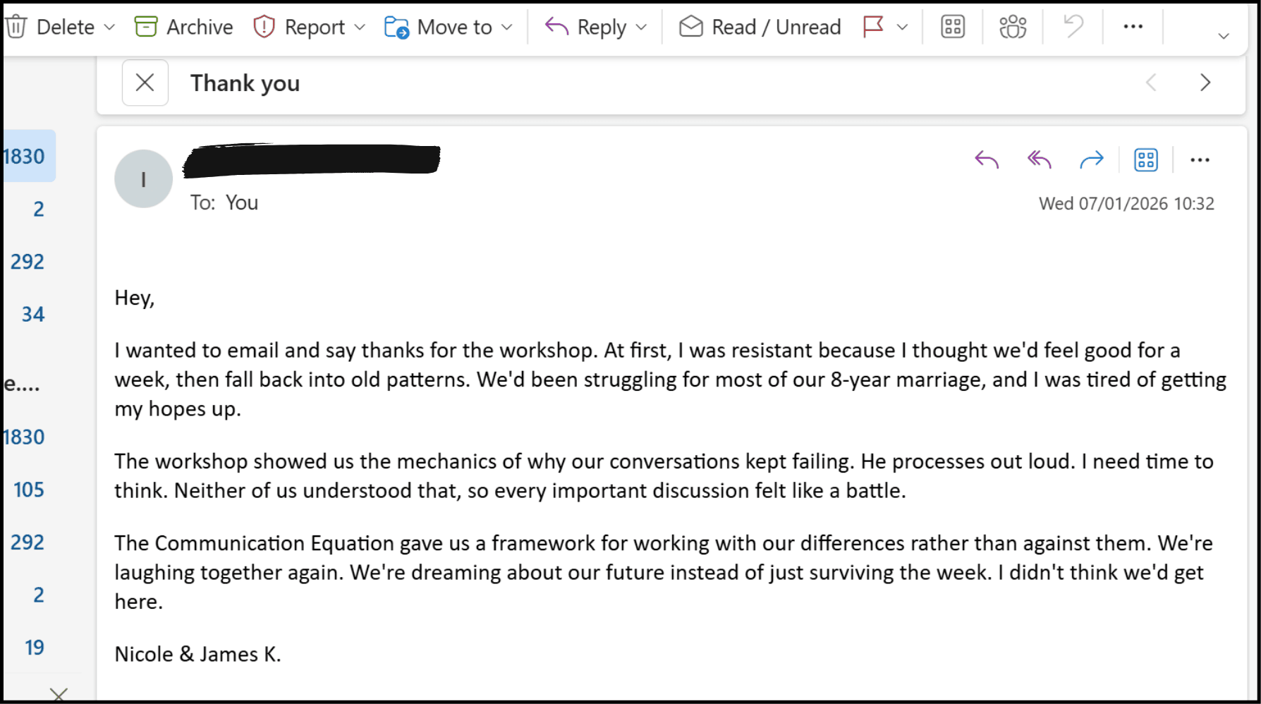If you don’t love the workshop or can’t reconnect with your spouse, you can ask for a complete refund for up to 45-days no questions asked just email:
